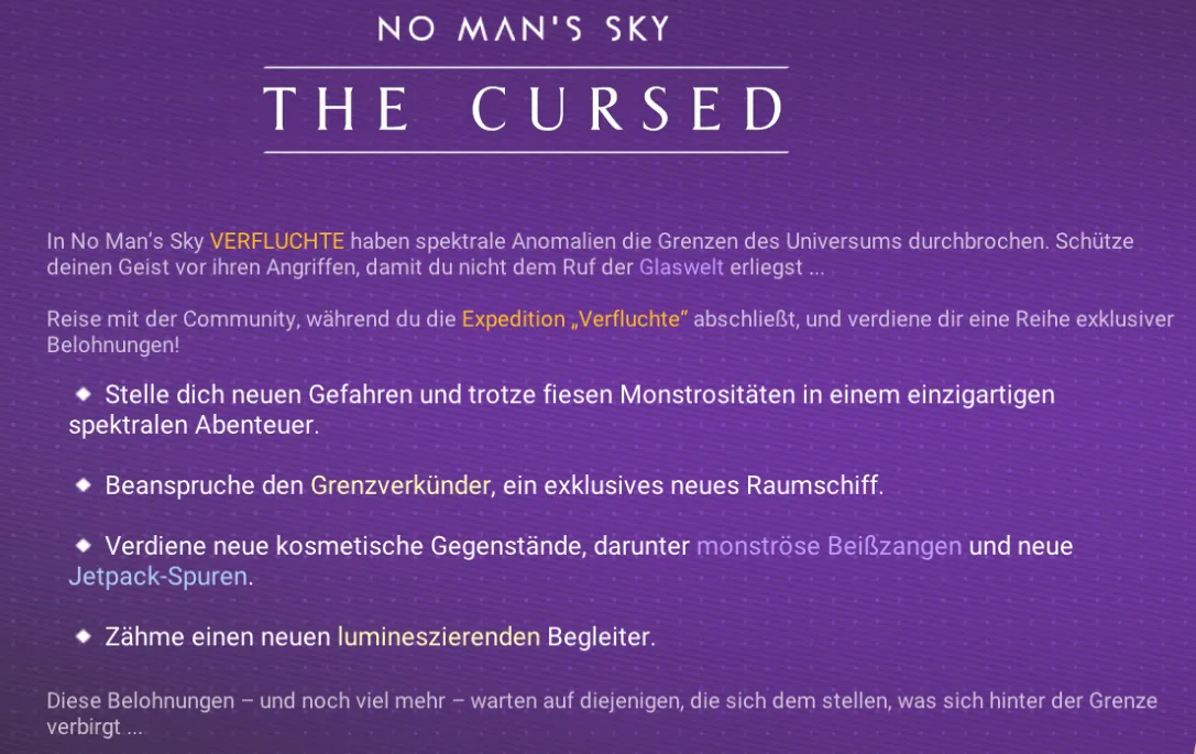BTW: Ich hoffe SCHWER (!!!), dass diese "The Cursed"-Charakteristika sich als fester Bestandteil des Hauptspieles eingliedern wird, z.B. globale oder systemische Anomalie auf bestimmten Planeten (wie nach dem Buch "Solaris") oder in anomalen Sonnensystemen selbst. Weil ich find diese Nummer echt gewitzt und bläst nochmal richtig Abwechslung in NMS hinein.